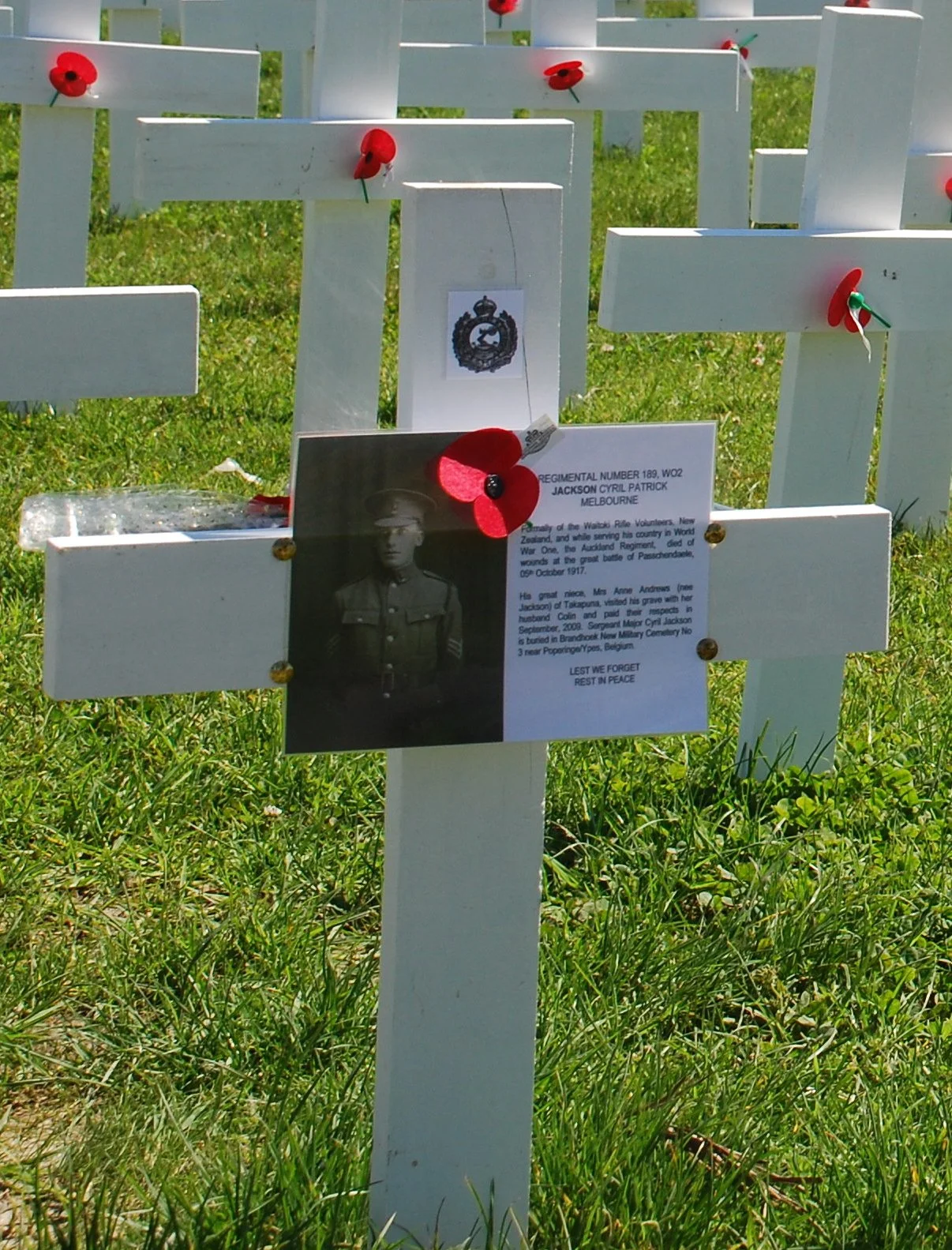 This exhibition was sent, free of charge, to New Zealand where it visited Wellington, Christchurch, Dunedin, Featherston and the National Army Museum in Waiouru before finishing its journey in Auckland. The wonderfully successful exhibition was staged at Fort Takapuna and attracted more than 10,000 visitors. 5,000 white crosses were erected on the old parade ground. As the exhibition progressed, those crosses became decorated by family members with photographs and details of those who had fallen. The anonymous crosses turned into personalised remembrance symbols.